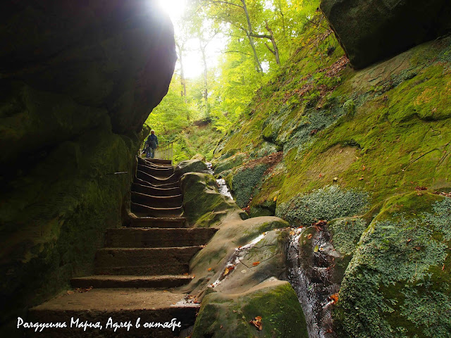 Дантово ущелье - совместное творчество природы и человека. Движение горных пластов и потоки воды образовали здесь узкое ущелье, а люди в XIX веке вырубили в податливом песчанике лестницу в 49 ступеней.